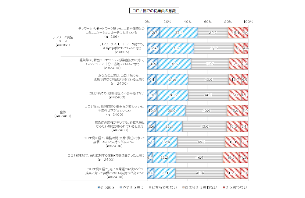 ・肯定的な意見が多かったのは「テレワーク・リモートワーク禍でも、上司や同僚とのコミュニケーションは十分にとれている」や「テレワーク・リモートワーク禍でも、正当に評価されていると思う」など、テレワークに関連する項目であった。