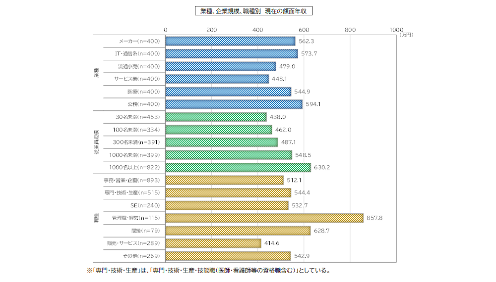 今回は、上記のうち「⑤業種別・規模別・職位別・年次別・転職経験別の額面年収の状況」について報告します。