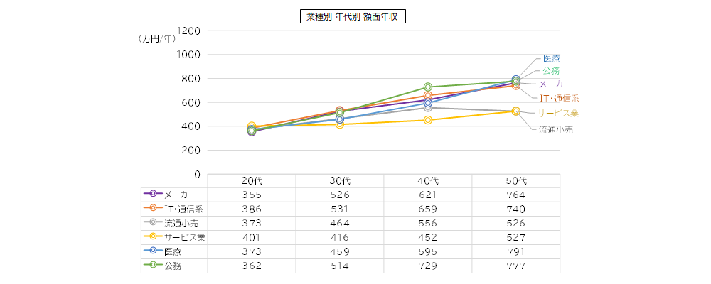 ・業種別の額面年収の従業員規模別の推移をみると、「公務」は「40代」が他の業種より高い傾向があるが、「50代」で「医療」、「メーカー」、「IT・通信系」で近い水準となる。