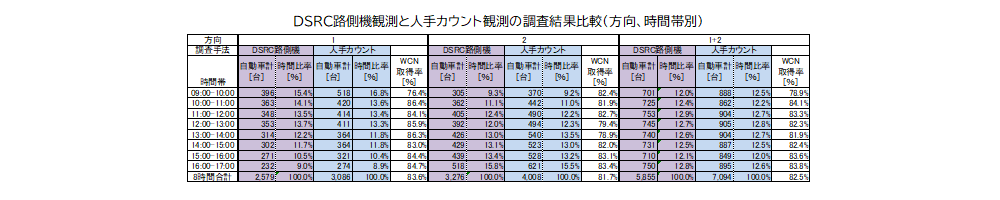 ・人手カウントの計測結果を100%とした場合、DSRC路側機でのWCN取得率は8時間合計値で方向1が83.6%、方向2が81.7%であった。