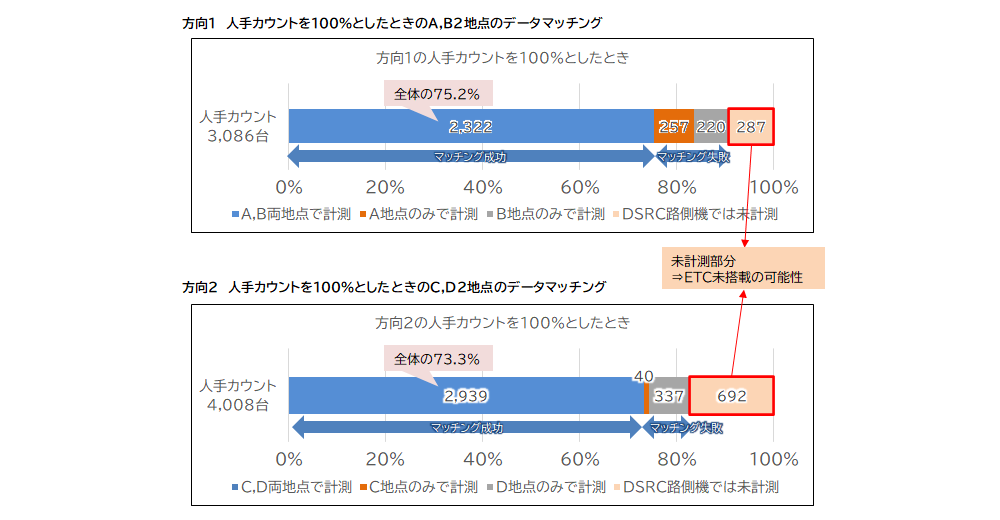 なお、二輪車については高速道路を走行できない総排気量125CC以下の自動二輪車や原動機付自転車が含まれてしまうため、ETC車載器の搭載している車両が少ないことから今回は比較対象外とし、二輪車を除いた自動車計を画像解析結果の数値として用いている。