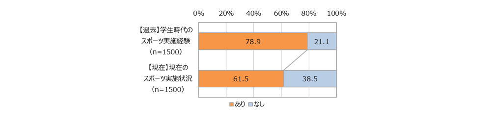 学生時代におけるスポーツの実施経験について尋ねたところ、78.9%が何らかのスポーツを実施していたと回答しました。一方、現在のスポーツの実施状況については、61.5%という結果になりました。