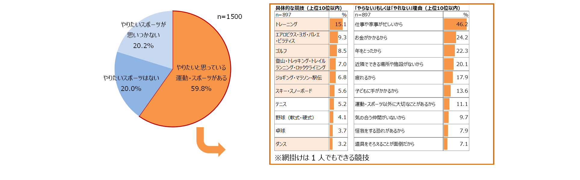 また、やりたいと思っていても「やらない」もしくは「やれない」理由については、「仕事や家事が忙しいから」、「お金がかかるから」、「子供に手がかかるから」といった家庭もしくは経済的な理由以外にも、「近隣でできる場所や施設がないから」20.1%、「気の合う仲間がいないから」9.7%といった理由も上位に入る結果となりました。