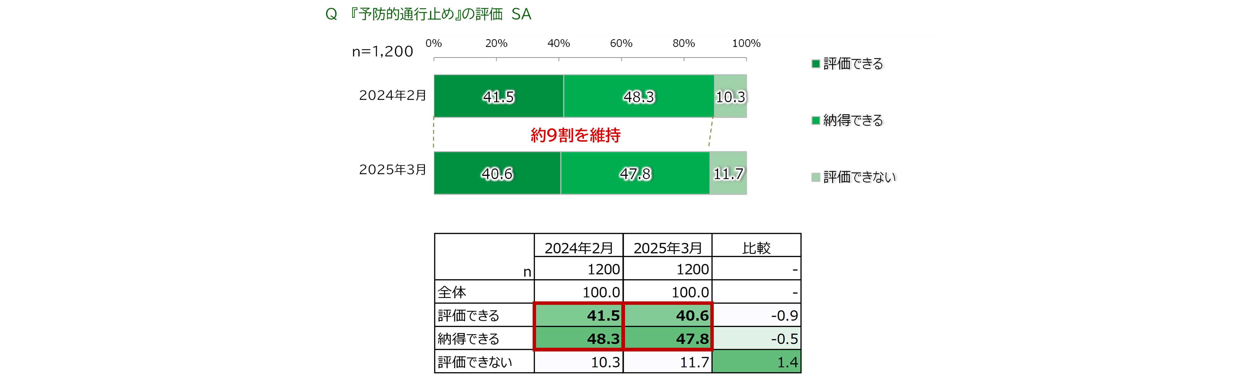 ✓今回の『予防的通行止め』の周知が、当日午前11時の緊急発表、また実際の積雪が予報よりも少なく、かつ夜間であったが、『予防的通行止め』を “評価できる” ・ “納得できる” と回答した割合は、前回同様に約9割であり、広く理解を得られている