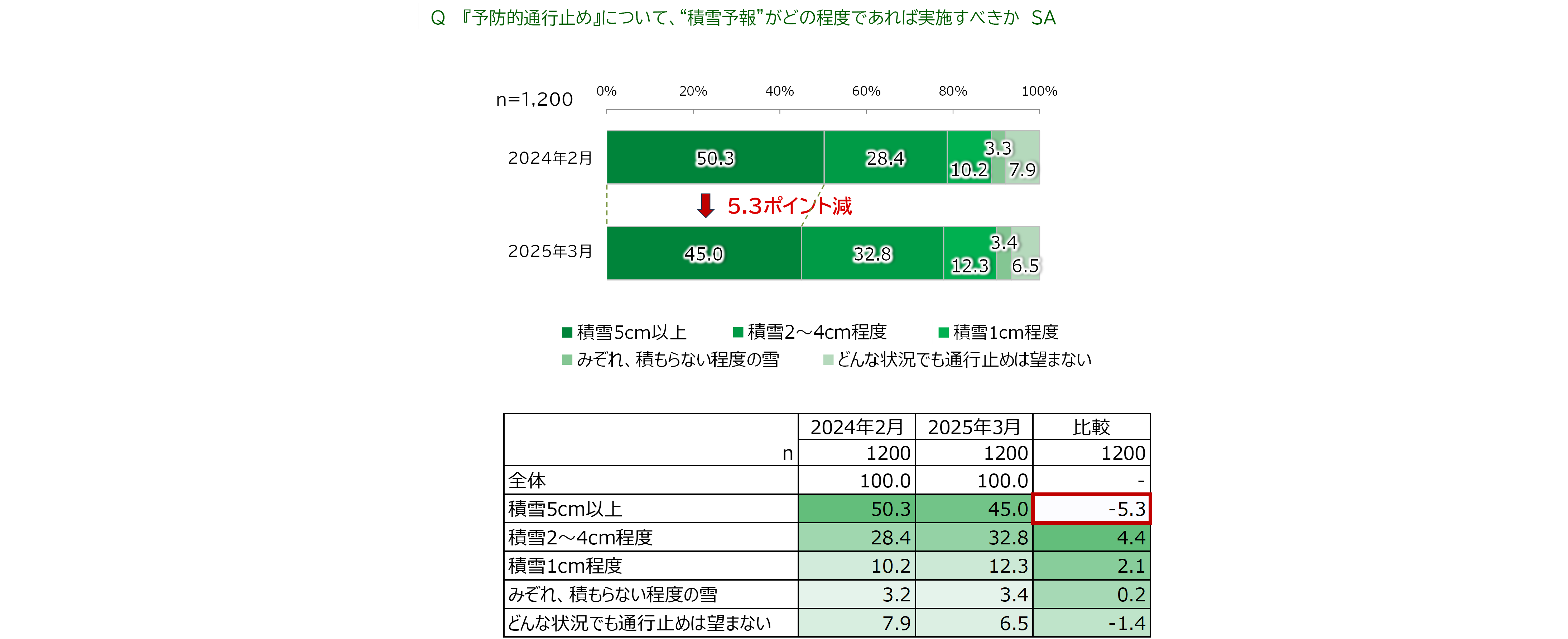 ・積雪予報における『予防的通行止め』の実施判断について、 “積雪5cm以上” と回答した割合は45.0%で、前回(50.3%)と比較し5.3ポイント減少した。