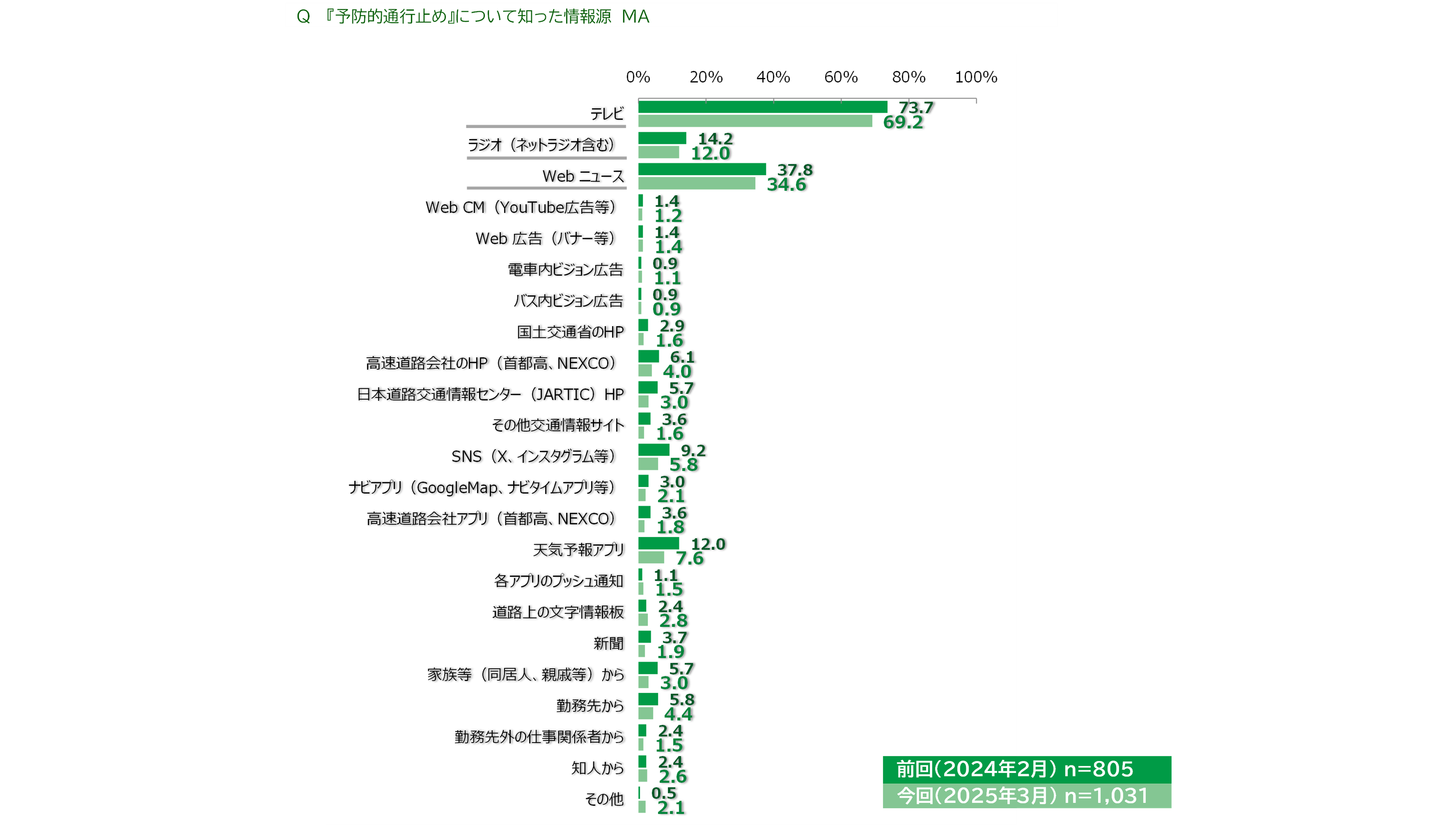・2025年3月4日(火)~5日(水)にかけ、関東地方での大雪による立往生などのおそれがあったため、高速道路や国道において予防的通行止めが実施されました。首都圏での予防的通行止めは、2024年2月5日(月)以来の実施であり、その際当社では、予防的通行止めの認知経路、行動変容、施策評価について、インターネットパネルを用いてアンケートを実施いたしました。