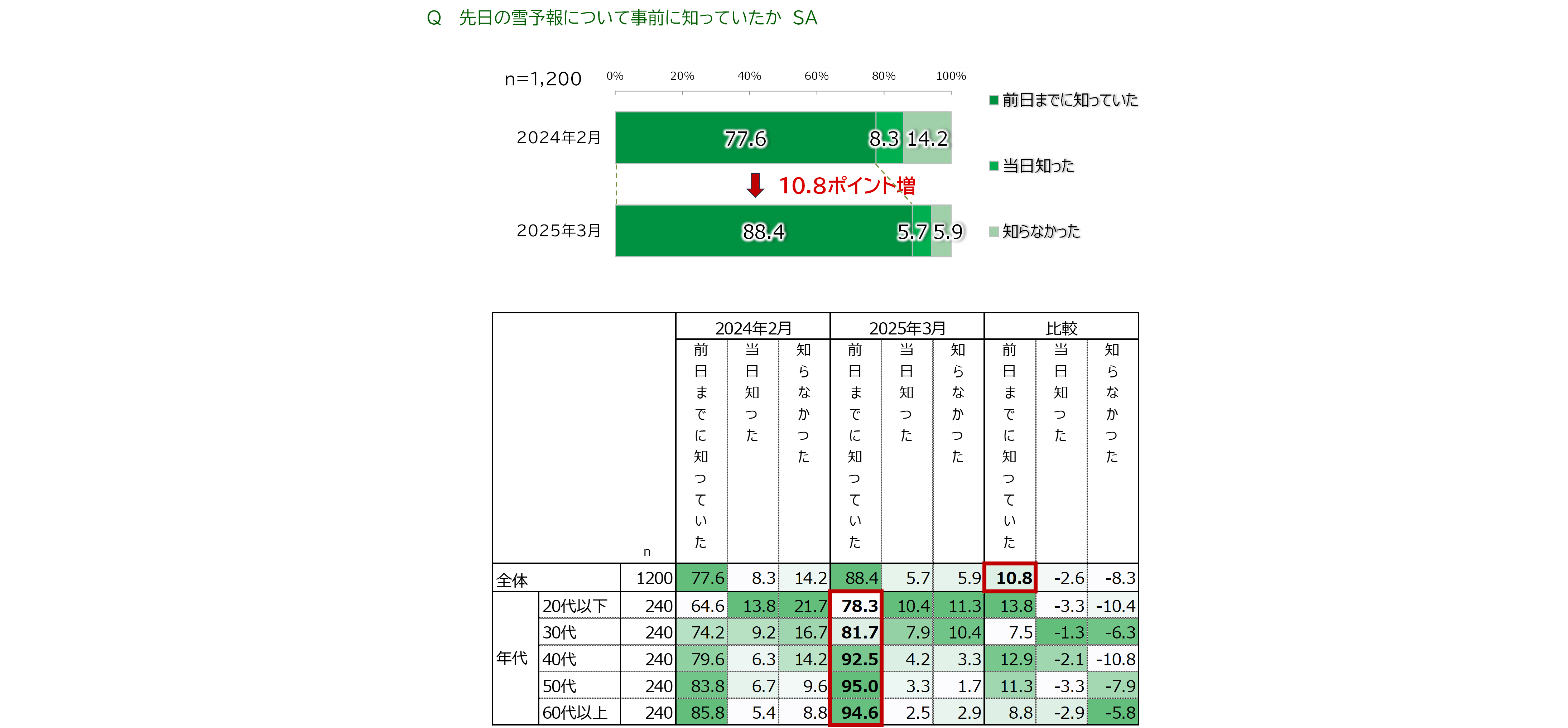 ✓雪予報を“前日までに知っていた”割合は88.4%で、前回(77.6%)と比較し10.8ポイント増加した。
