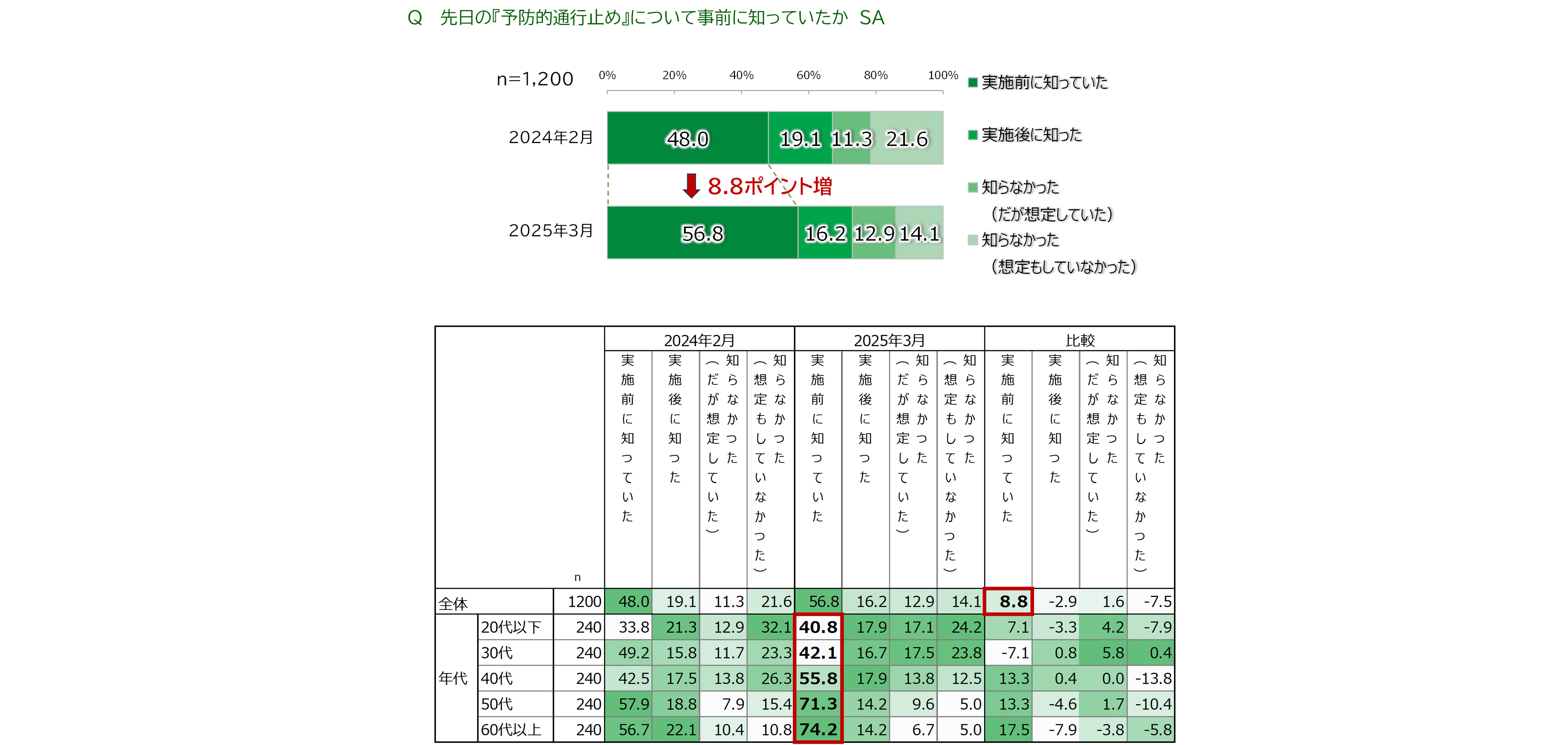 ・『予防的通行止め』について、“実施前に知っていた”割合は56.8%で、前回(48.0%)と比較して8.8ポイント増加した。