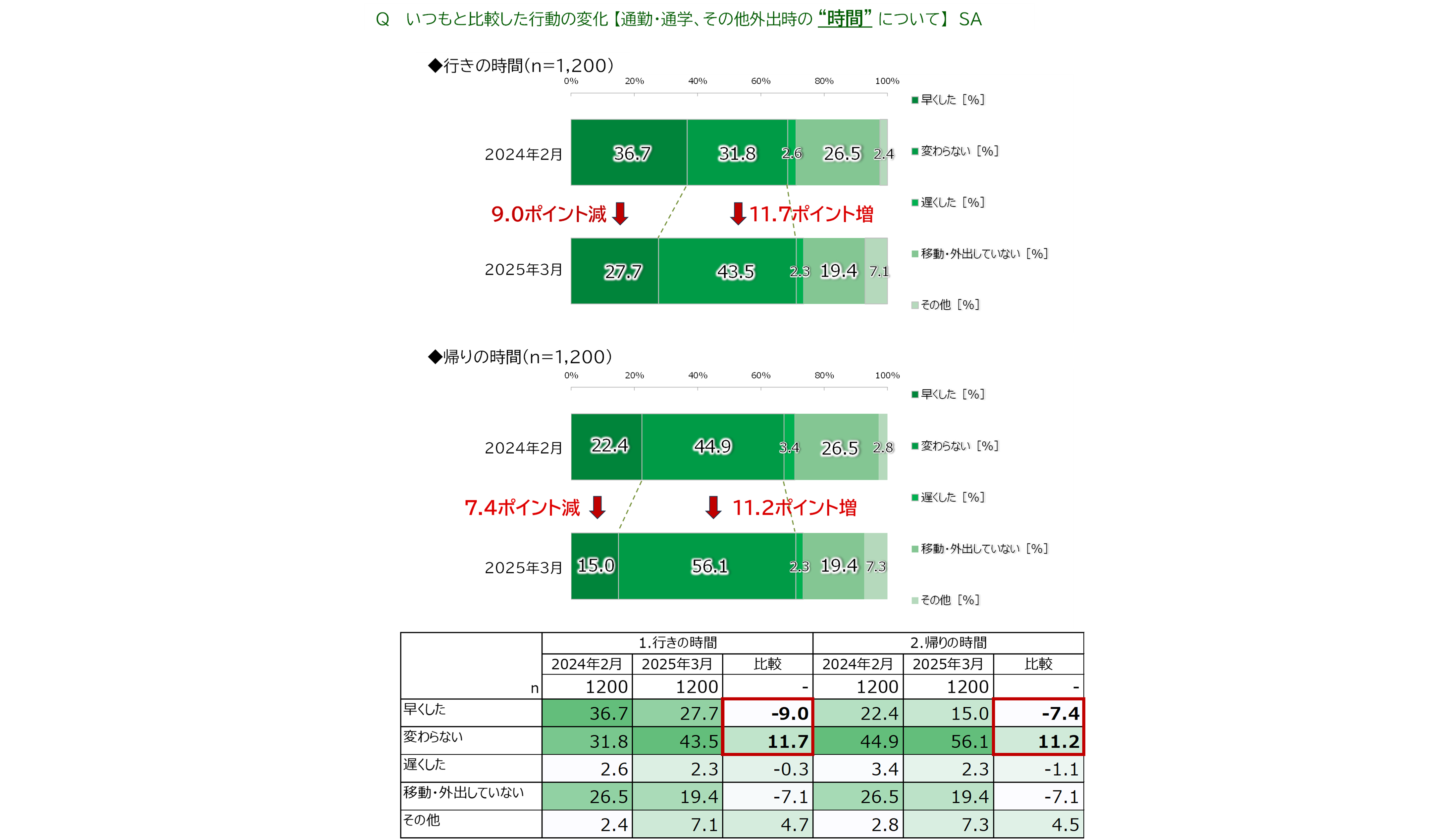 ・“行きの時間” を早くした割合は27.7%で、前回(36.7%)と比較し9.0ポイント減少した。