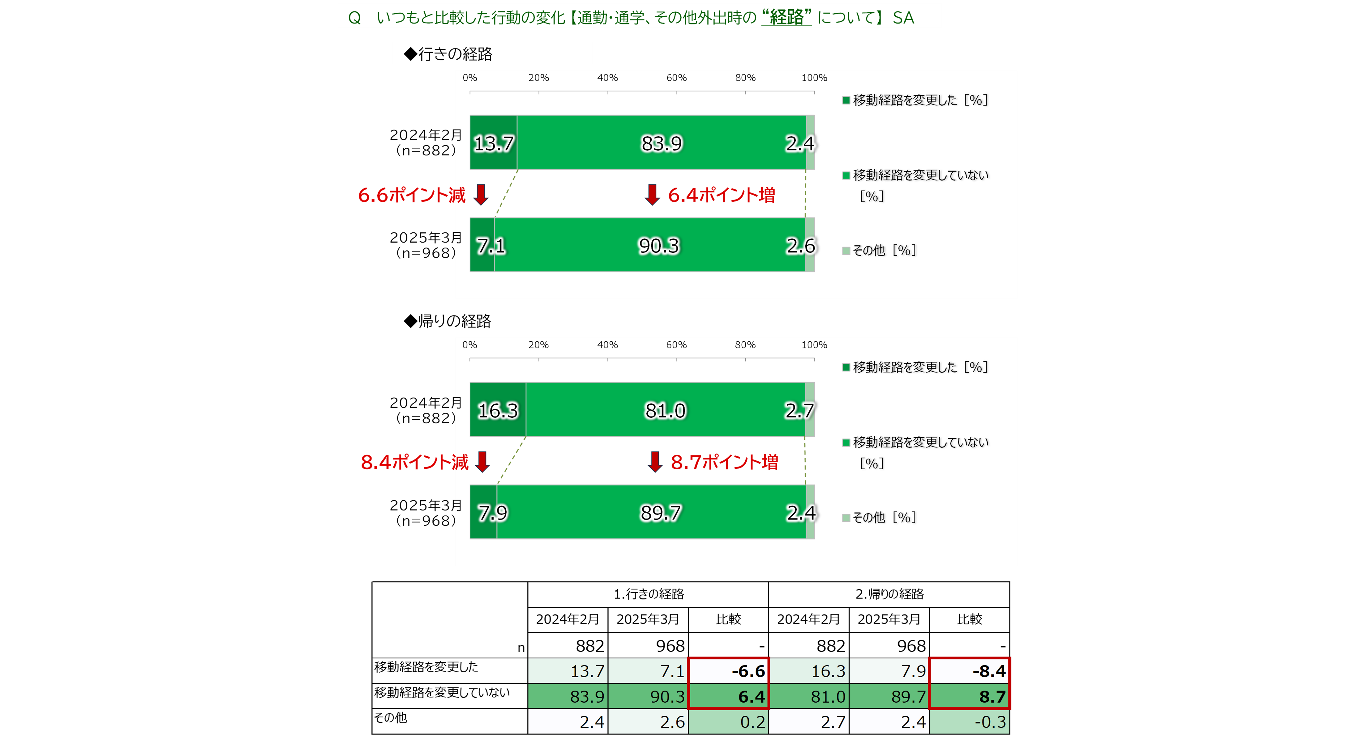・“行きの経路” を変更しなかった割合は90.3%で、前回(83.9%)と比較し6.4ポイント増加した。