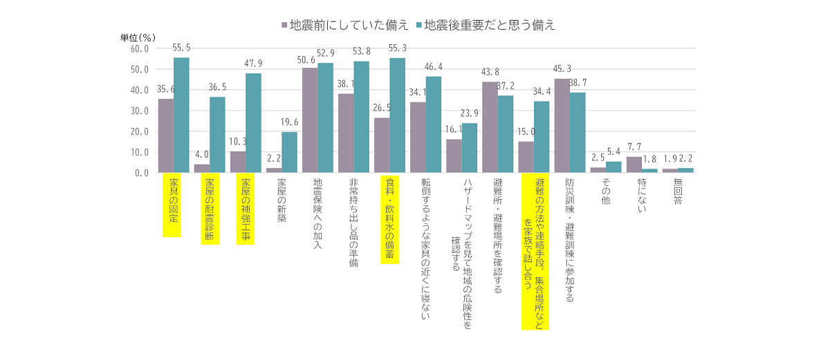 ・地震後に割合が大きく増加している項目=準備しておけばよかったという後悔